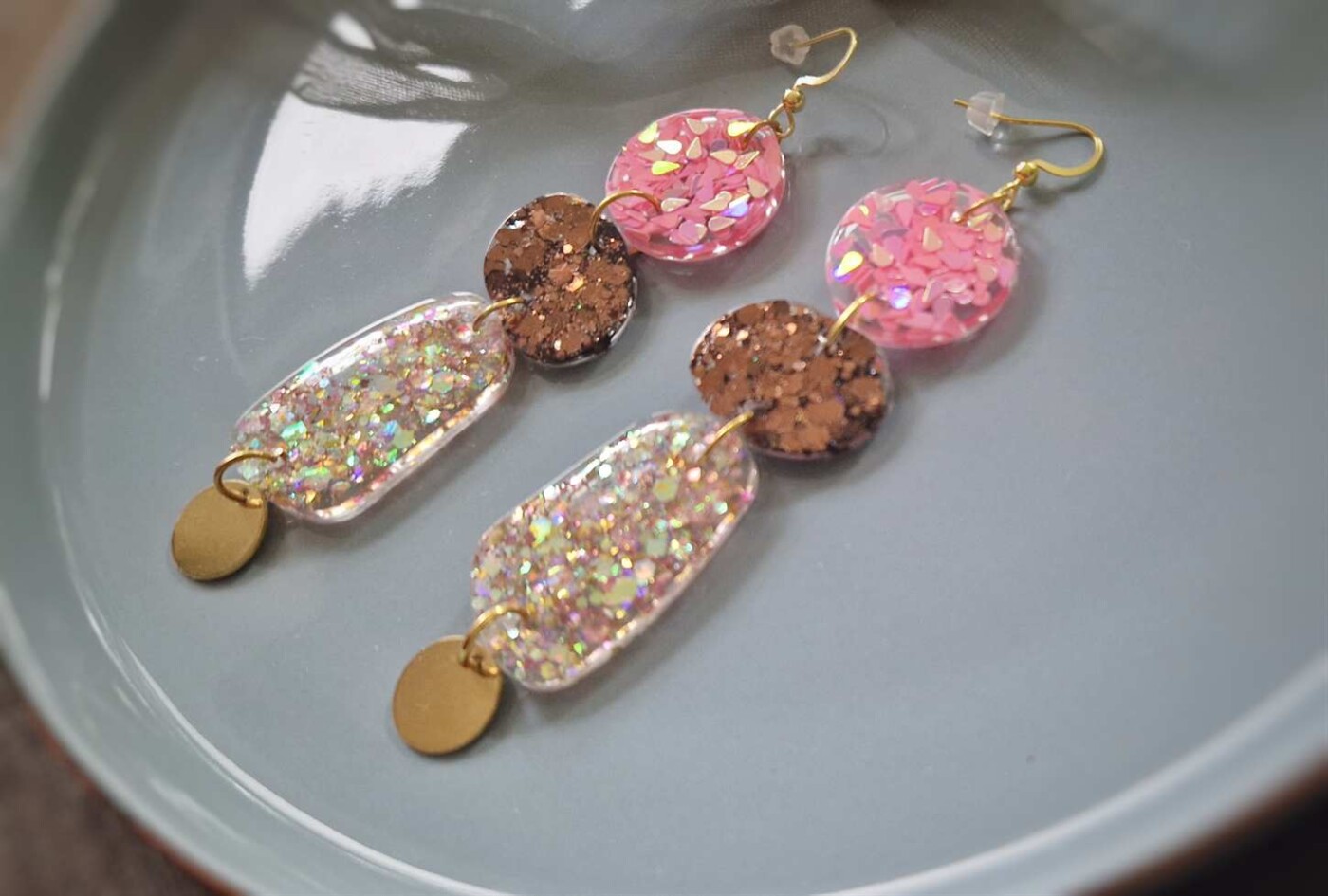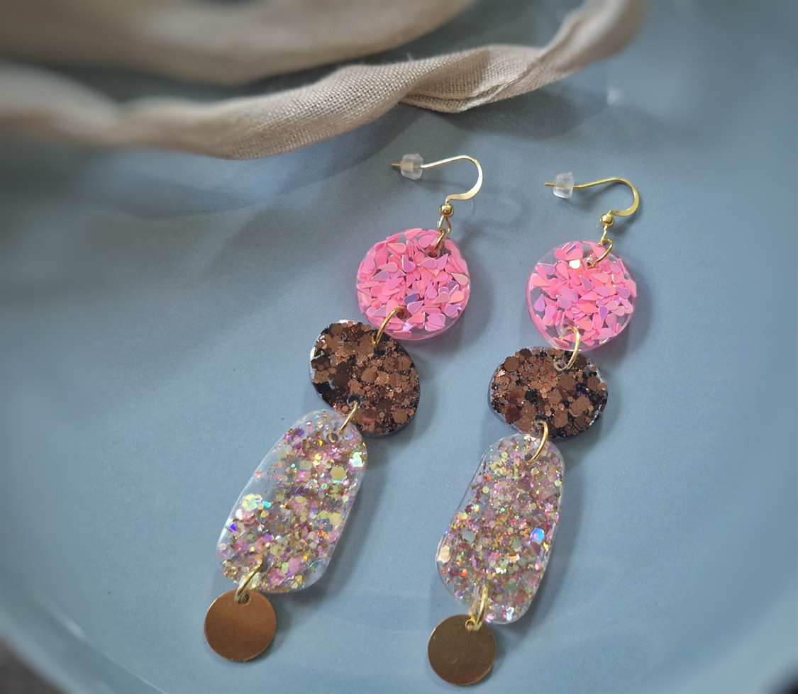 In den transparenten organisch geformten Boho-Anhängern strahlt es in altrosa, kastanienbraunem und magentapinkem Glitzer, das je nach Lichteinfall strahlend changierend leuchtet, Akzente setzt und diese langen Statementohrringe zu individuellen Begleitern macht. Echte handgefertigte Kunstohrringe