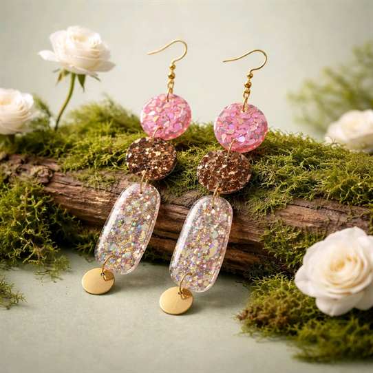 - In den transparenten organisch geformten Boho-Anhängern strahlt es in altrosa, kastanienbraunem und magentapinkem Glitzer, das je nach Lichteinfall strahlend changierend leuchtet, Akzente setzt und diese langen Statementohrringe zu individuellen Begleitern macht. Echte handgefertigte Kunstohrringe / Unikatschmuck. Die Ohrhaken bestehen aus nickelfreiem Edelstahl.