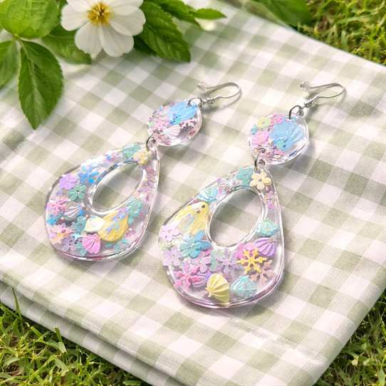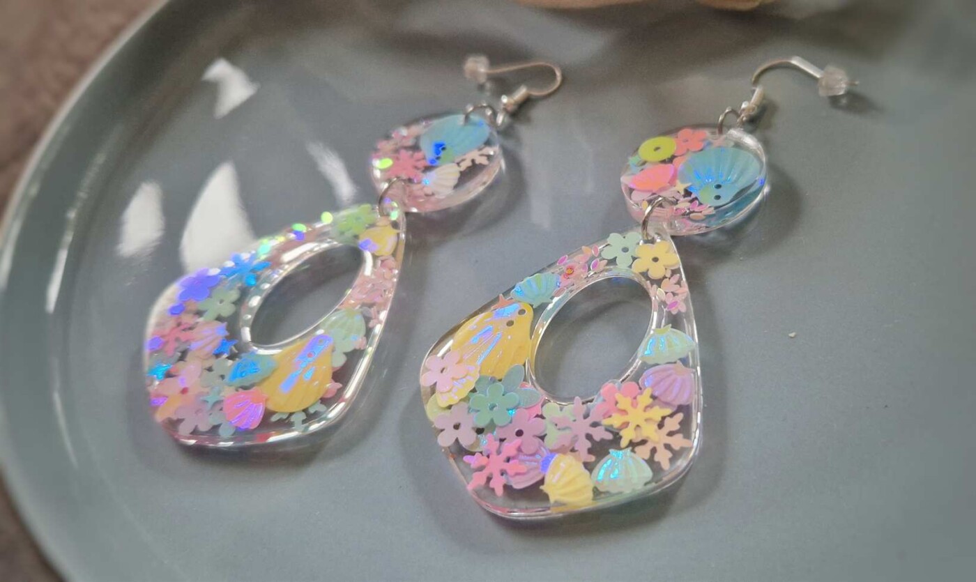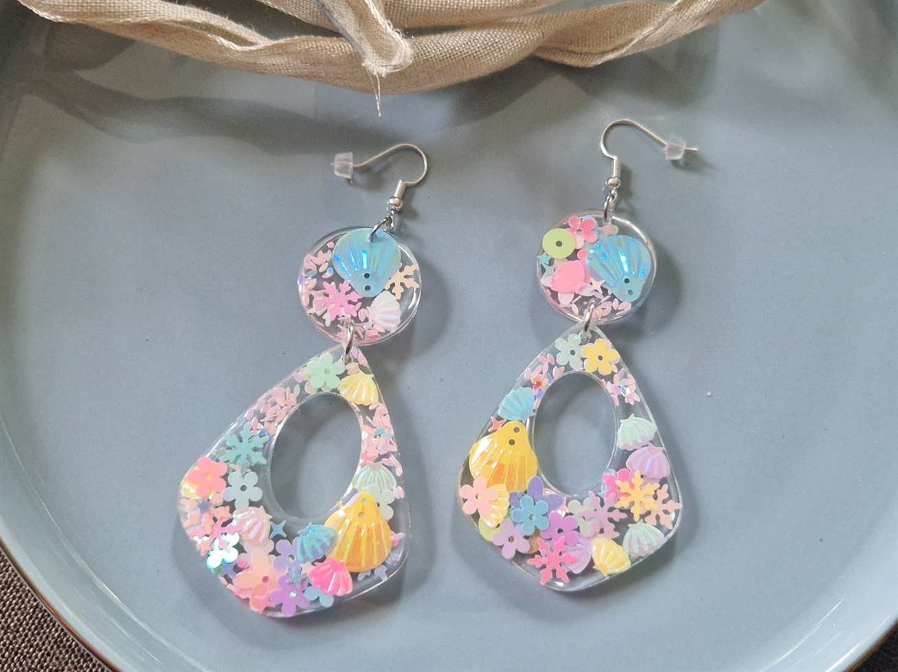 In den transparenten großzügen Boho-Anhängern wurden glitzernde Blumen- und Muschel-Pailletten in sommerlichen Pastelltönen gegossen, die je nach Lichteinfall strahlend türkis-changierend leuchten, Akzente setzen und diese Statementohrringe zu individuellen Begleitern machen. Echte handgefertigte Kunstohrringe
