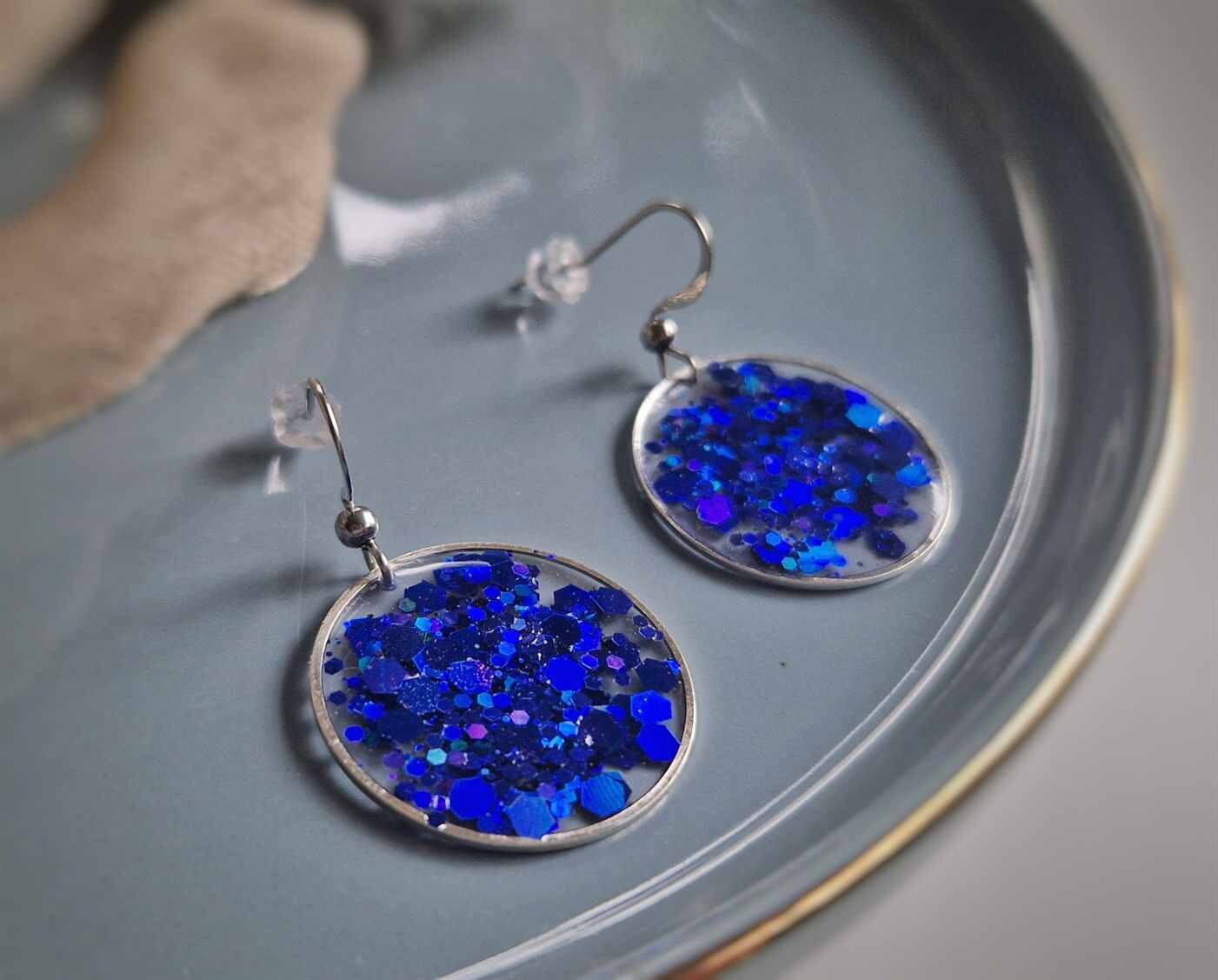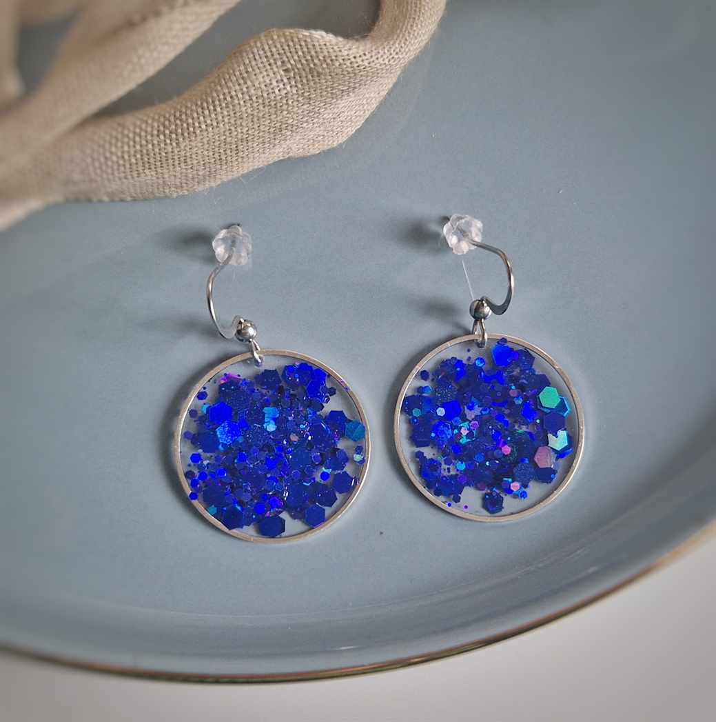 In einer hauchzarten silbernen Kreislünette wurde in das transparente Resin nachtblaue Glitzerpartikeln gegossen, um diese elegante Farbkomposition zu kreieren.