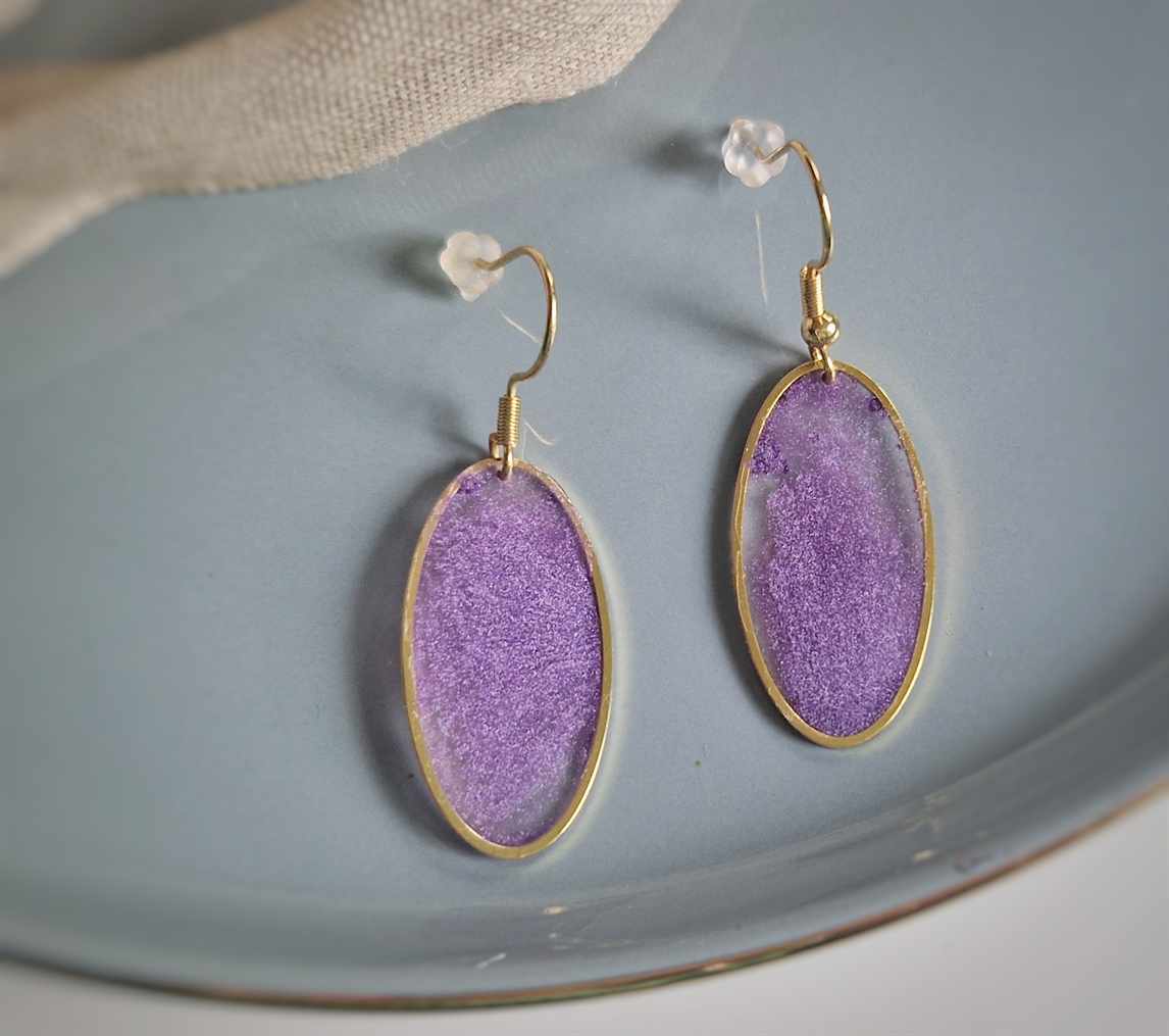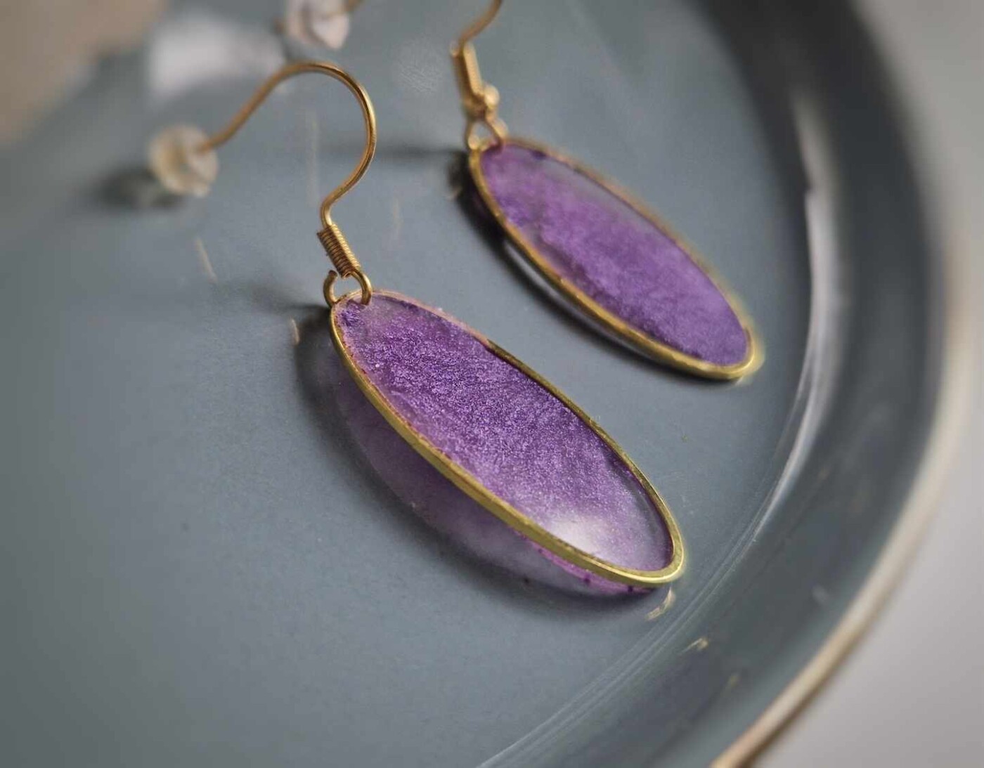 Diese elfenhaften transparenten ovalen Ohrringe in goldener Lünette funkeln und leuchten herrlich in einem pudrigen Violett und sorgen für einen eleganten Auftritt.