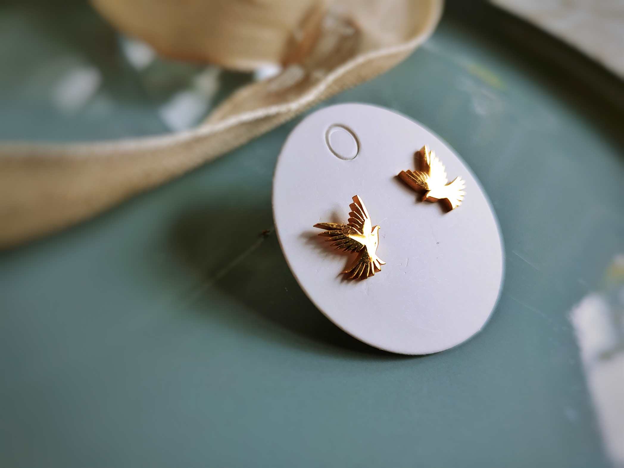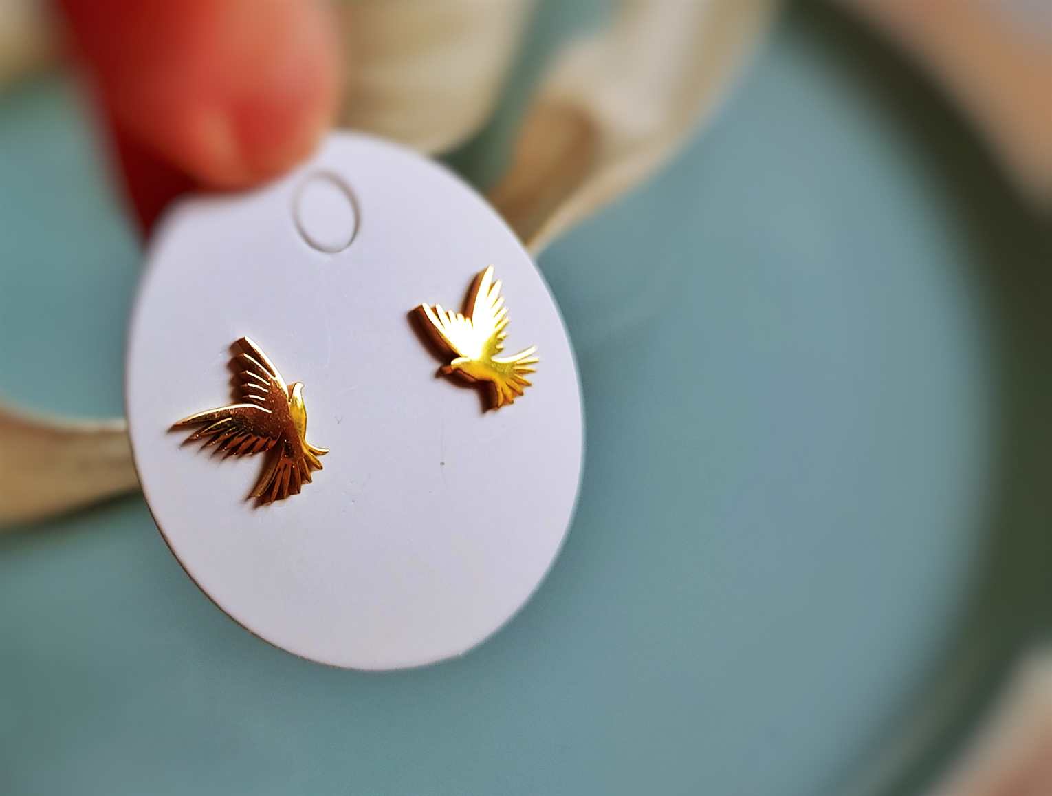 In glänzendem goldenen Edelstahl präsentieren sich diese zierlichen Ohrstecker in Form einer fliegenden Taube und bringen nicht nur junge Gesichter zum Strahlen.