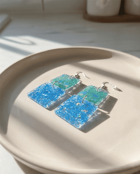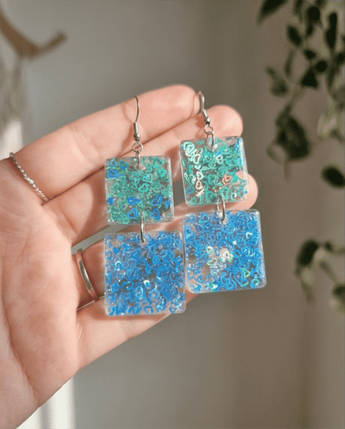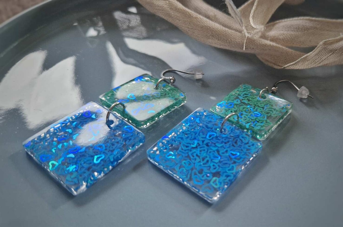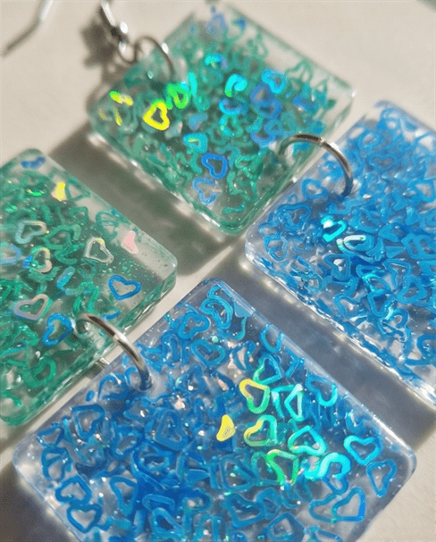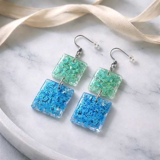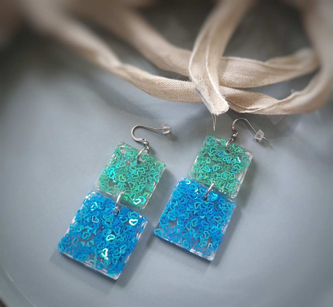 - In den transparenten viereckigen-Anhängern wurden glitzernde meergrüne und türkise Herzchen-Pailletten gegossen, die je nach Lichteinfall strahlend leuchten, Akzente setzen und diese Statementohrringe zu individuellen Begleitern machen. Echte handgefertigte Kunstohrringe / Unikatschmuck. Die Ohrhaken bestehen aus nickelfreiem Edelstahl.