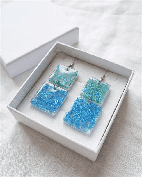 In den transparenten viereckigen-Anhängern wurden glitzernde meergrüne und türkise Herzchen-Pailletten gegossen, die je nach Lichteinfall strahlend leuchten, Akzente setzen und diese Statementohrringe zu individuellen Begleitern machen. Echte handgefertigte Kunstohrringe