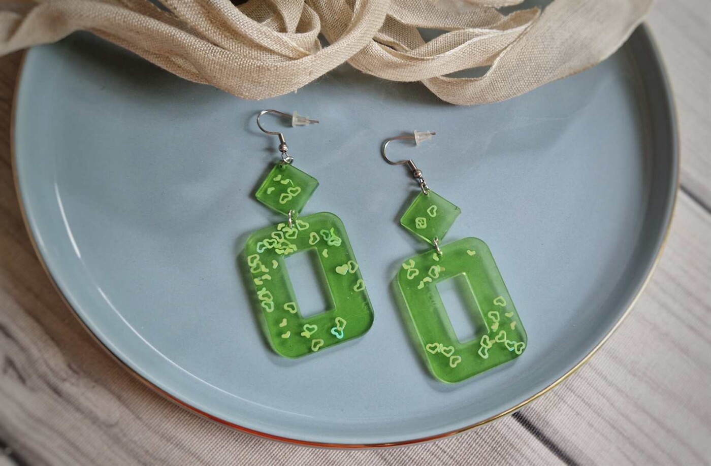 In einem frischen transparentem Hellgrün mit glitzernen Herzchen und Sternchen versprühen diese Statementohrringe jede Menge frischen Charme. Toller Boho-Stil. Die Ohrhaken bestehen aus Edelstahl (nickelfrei) und sind mit einem Silikonverschluss ausgestattet.